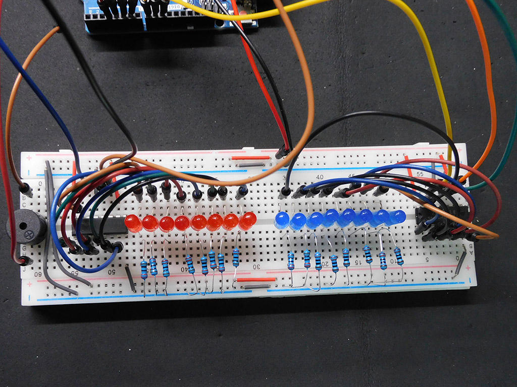 This experiment was done after Gerard completed the module on how sound is created using a small buzzer and the modules on using a shift register to address a number of LED (Light Emitting Diodes)