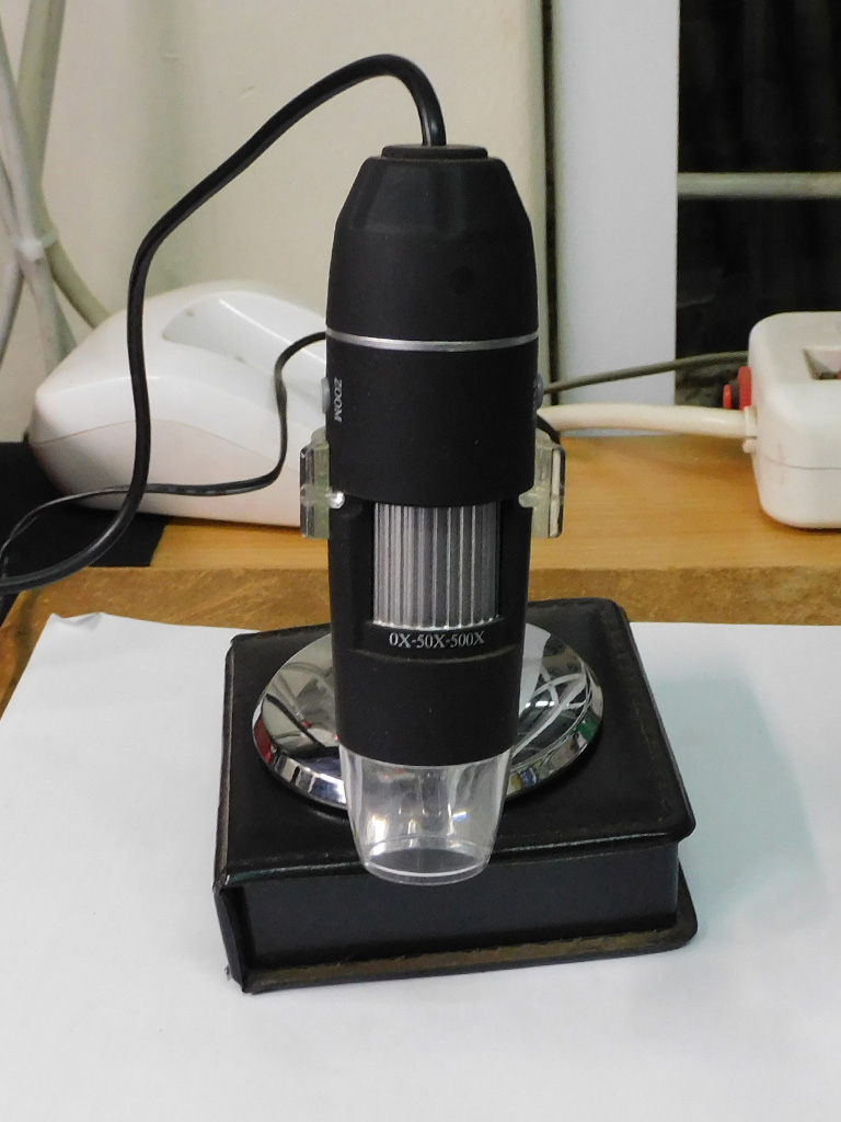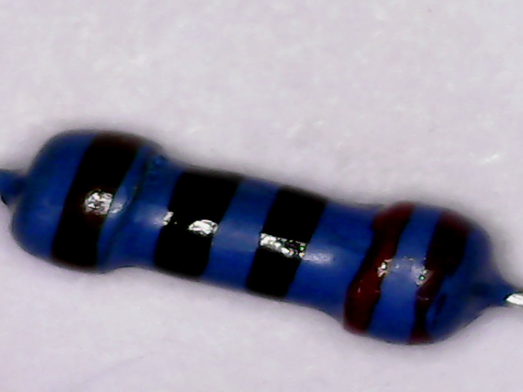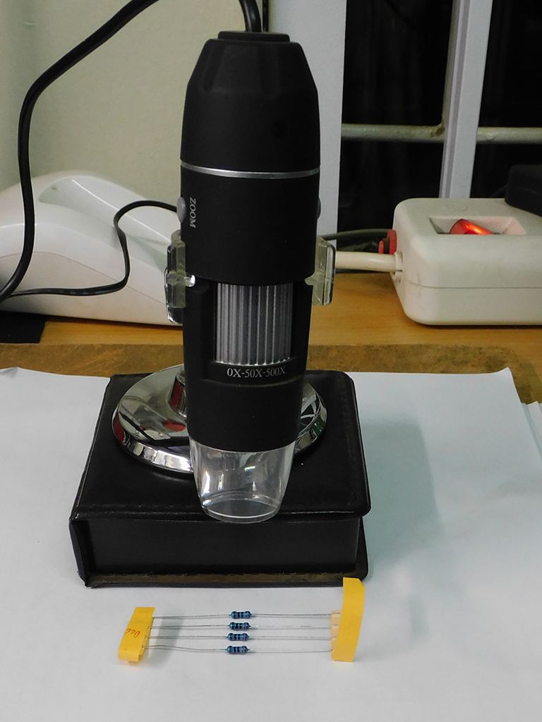 The resistors are difficult to read due their size (and Gerard´s age) so he employed a digital microscope to enlarge the resistor so that the colours can easily been recognised to determine the value.