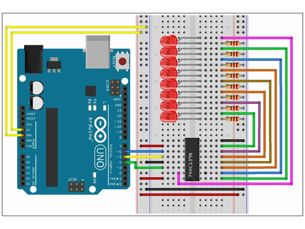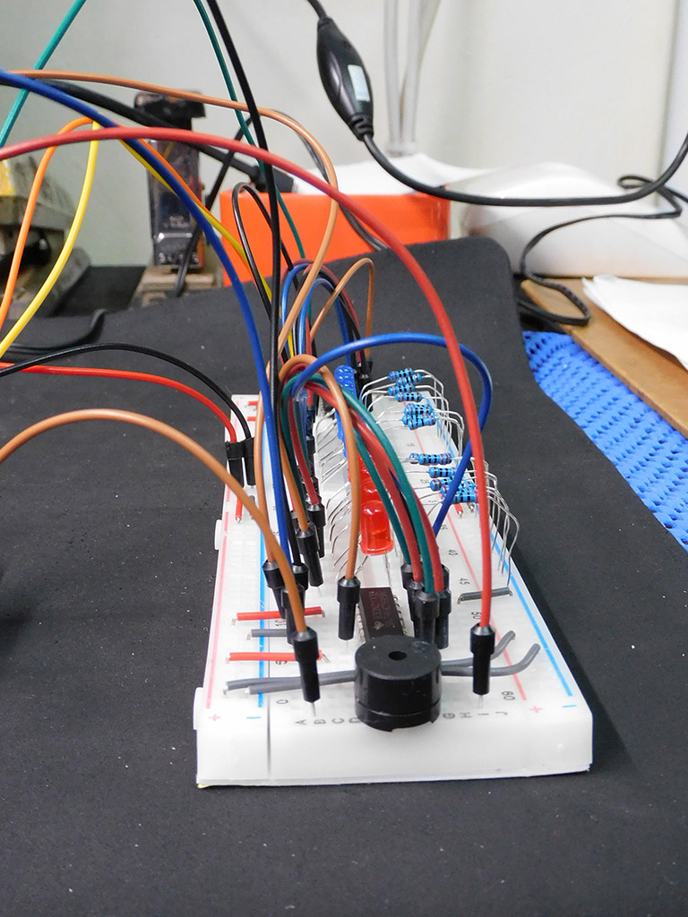 This experiment was done after Gerard completed the module on how sound is created using a small buzzer and the modules on using a shift register to address a number of LED (Light Emitting Diodes)